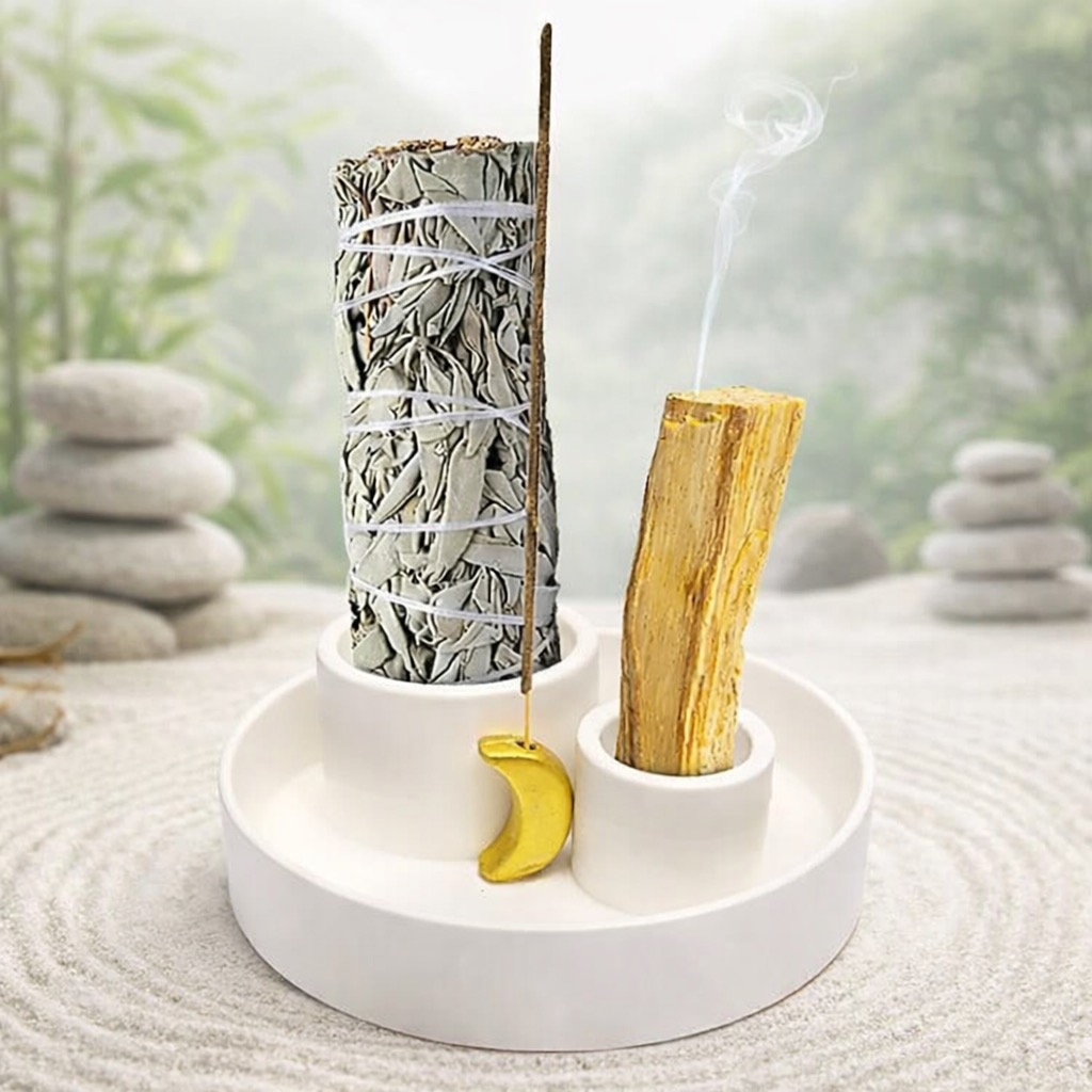 Pensé comme un allié du quotidien sacré, il accueille avec harmonie vos bâtons de Palo Santo, vos fagots de smudge(sauge, plantes sacrées) ainsi que vos encens traditionnels. Chaque fumigation devient alors un instant de recentrage, de purification et de connexion à soi. 🤍