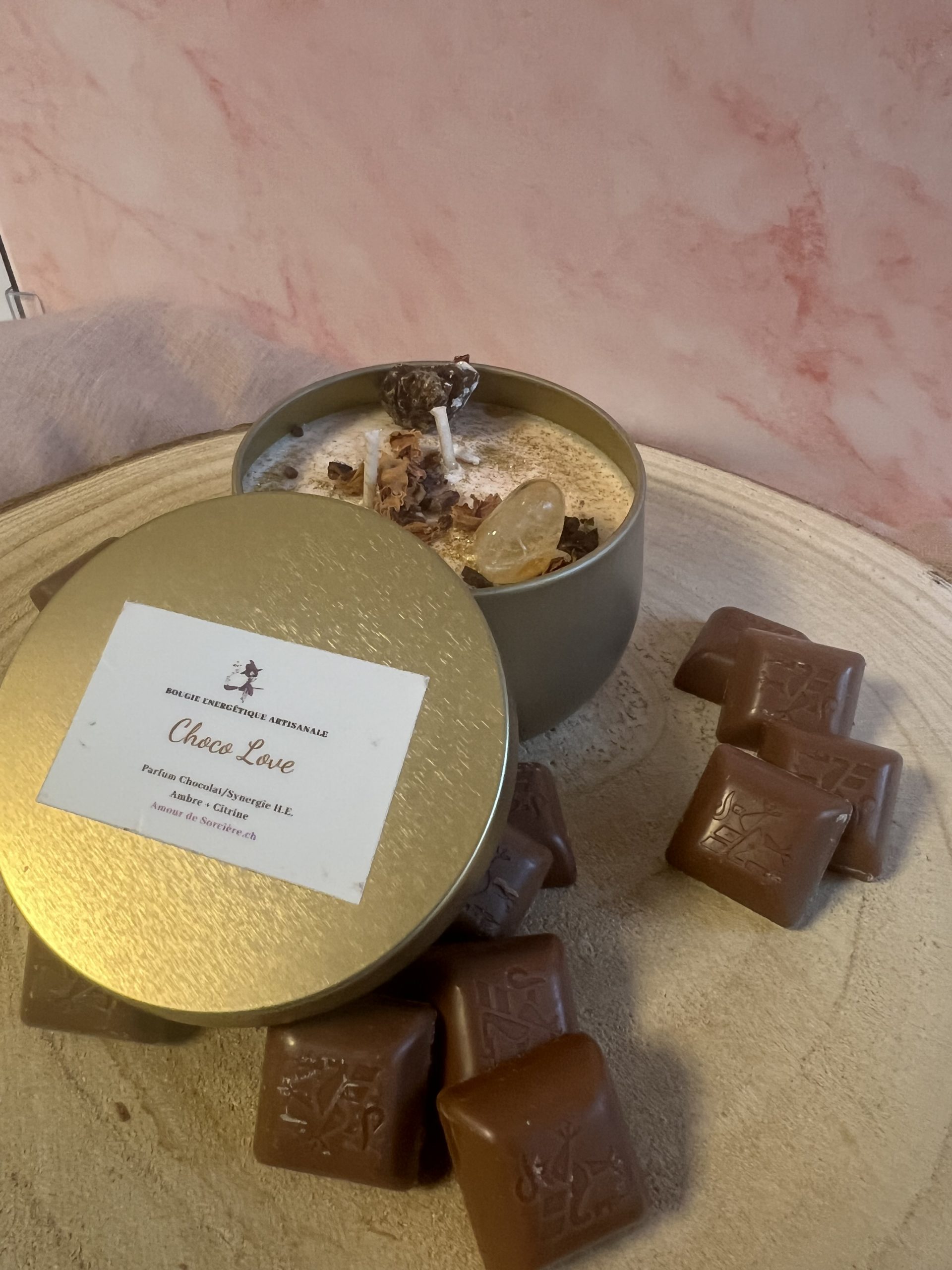 La Bougie Choco Love est parfumée à la senteur « Chocolat Gourmand » ainsi que d’un mélange subtil d’huiles essentielles comme l’Ylang-Ylang, le Santal, le Piment 4 épices et la Cannelle.