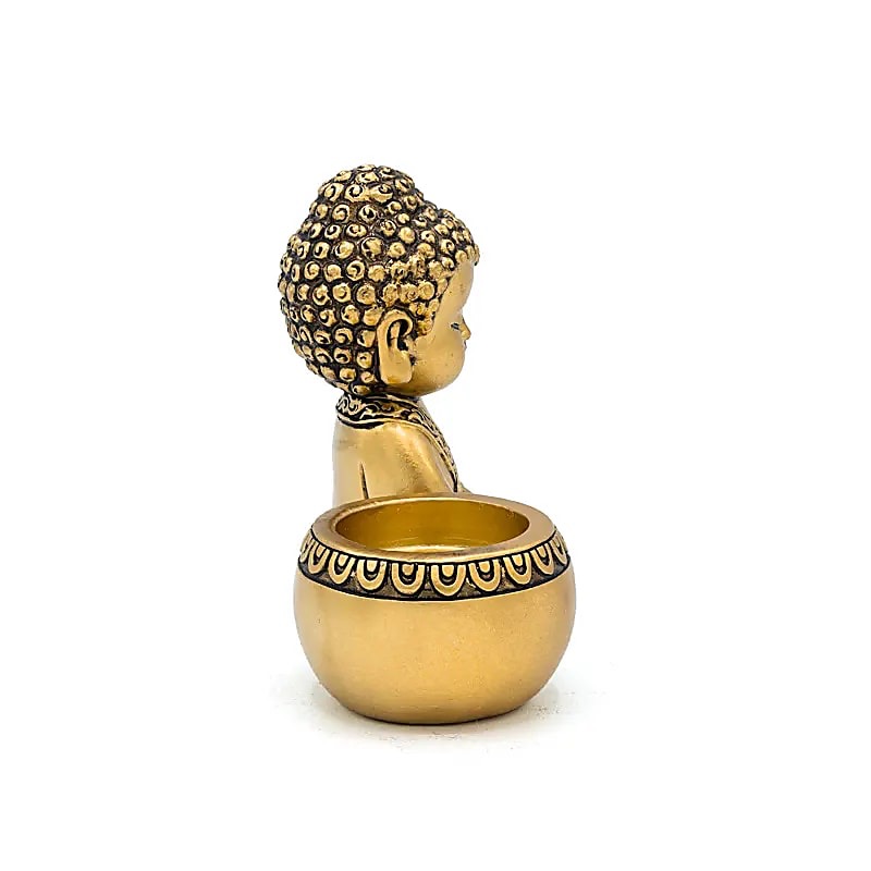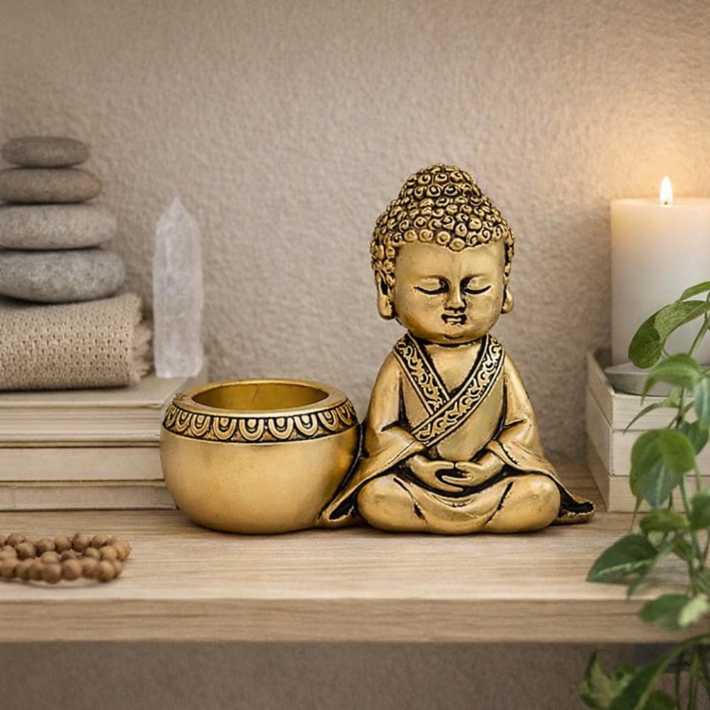 À ses côtés, le porte-bougie accueille une flamme douce dont la lumière chaleureuse vient souligner les traits paisibles de la figurine. Chaque lueur devient une invitation au ralentissement, à la méditation et au recentrage, transformant votre espace en havre de tranquillité.