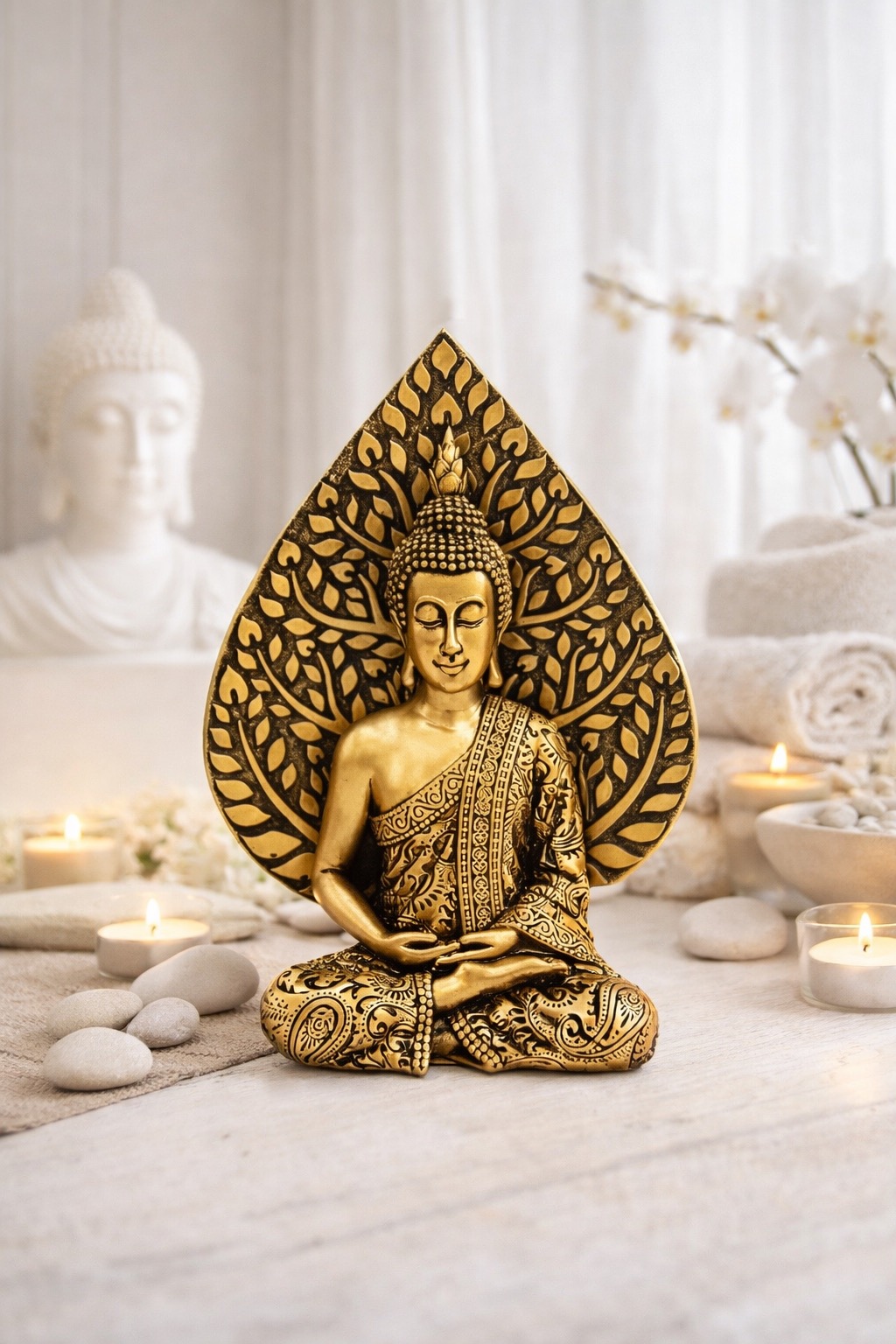 Apportez à votre intérieur une énergie de calme, de sagesse et de lumière avec cette magnifique statue de Bouddha en méditation, sublimée par une feuille de Bodhi grandeur nature en arrière-plan.