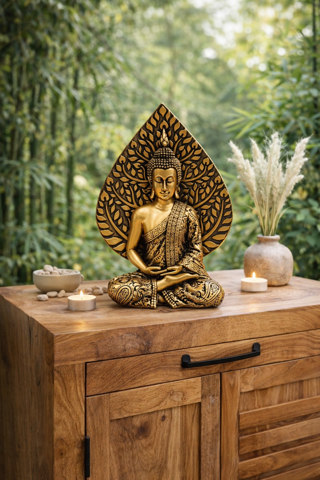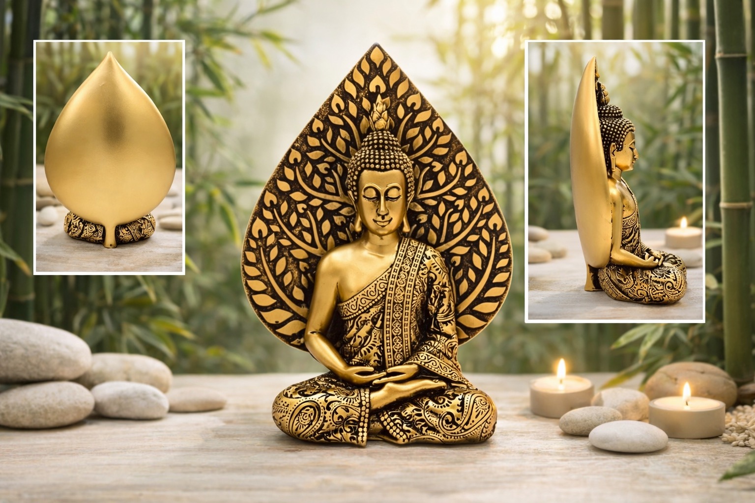 Derrière Bouddha se déploie la feuille de Bodhi, symbole profondément spirituel. Elle fait référence à l’arbre sacré sous lequel Bouddha Shakyamuni atteignit l’illumination, après une profonde méditation. Ainsi, cette statue devient bien plus qu’un objet décoratif : elle représente un chemin vers l’éveil, la sagesse et l’harmonie intérieure.
