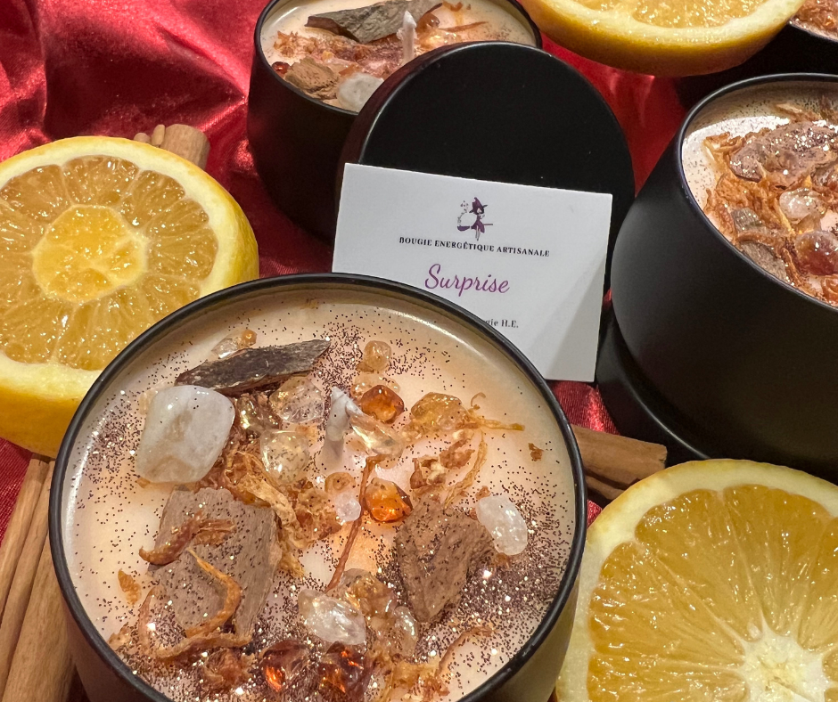 Cette bougie Surprise d’Automne a en plus de l’ écorce de cannelle pour l’énergie et la richesse et aussi du Zeste d’Orange pour l’énergie positive et la perception.